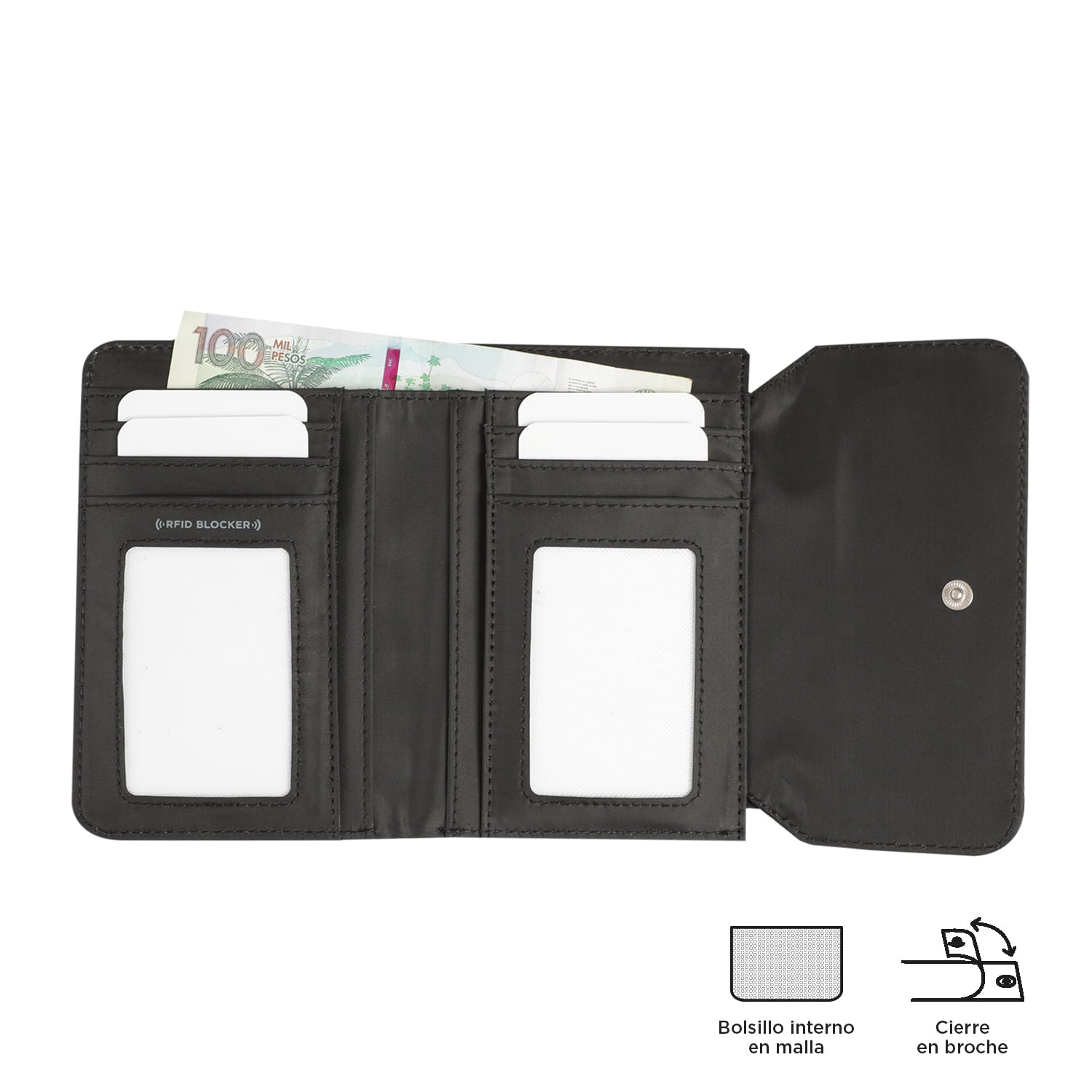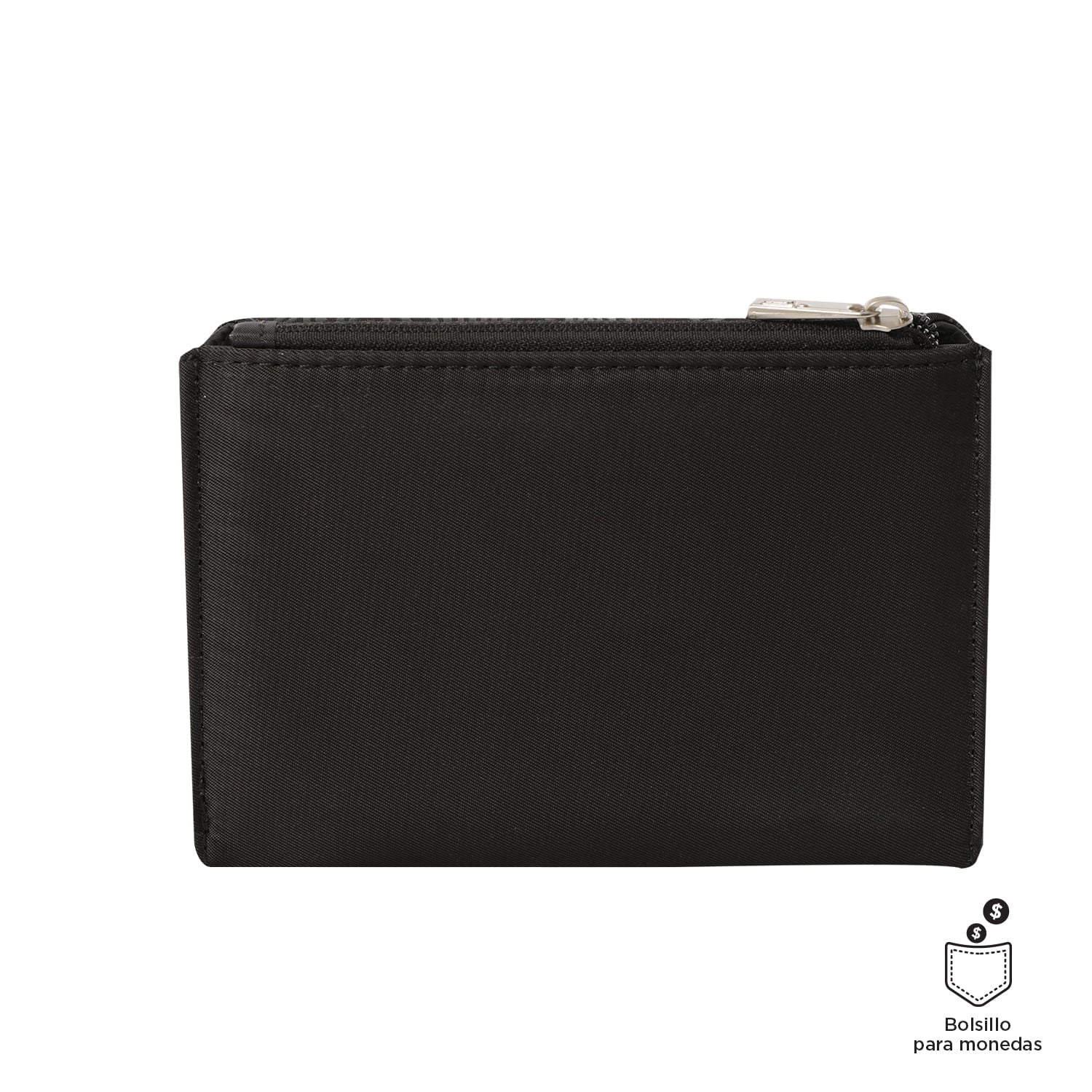 ¡Protege tus documentos con la billetera para mujer Montana! Este diseño mediano de dos cuerpos incluye cierre en broche, bolsillo para monedas, organizadores para tarjetas y billetes, además de un sistema RFID Blocker que evita la captura de información. Su tapa trae un sofisticado diseño en alto relieve tono a tono. Su material es resistente, de fácil cuidado y mantiene su color por más tiempo. ¡Llévala ahora!