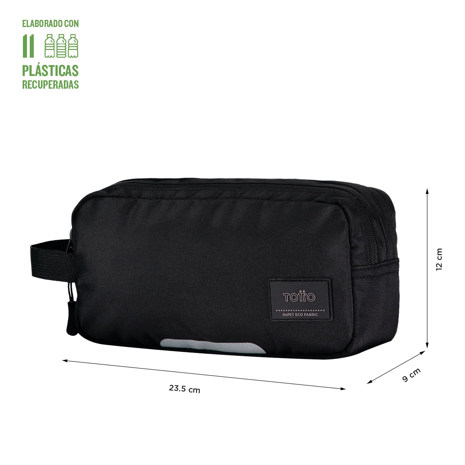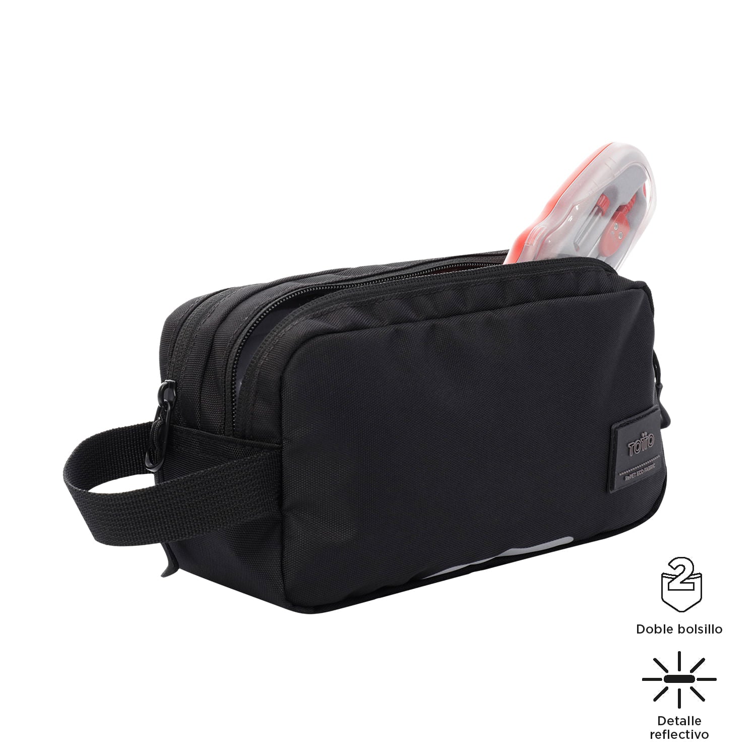 Nuestra cartuchera Marañon está diseñada para ofrecerte la máxima funcionalidad y estilo en un único producto. Esta cartuchera grande, confeccionada en poliéster reciclado de alta calidad, presenta un diseño versátil con detalle reflectivo y doble bolsillo para facilitar la organización de tus objetos. Además, su tecnología repelente a líquidos y su resistente manija fija garantizan la protección y comodidad que necesitas en tus actividades diarias.