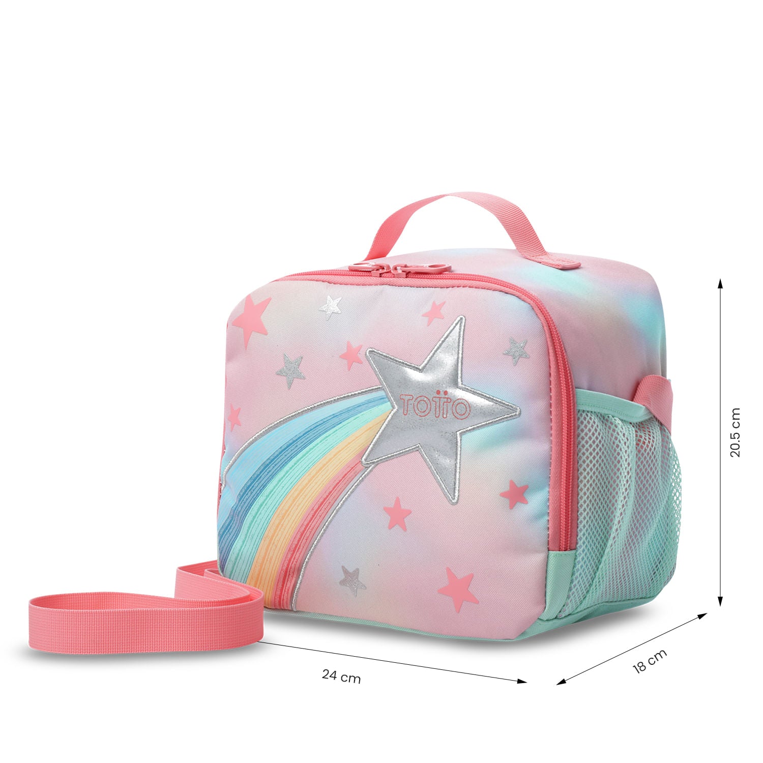¡Dale practicidad a sus días escolares con la lonchera Rainbow Star! Su compartimento principal amplio y cierre seguro protegen los alimentos manteniéndolos frescos hasta por 5 horas, mientras la reata ajustable permite llevarla al hombro o cruzada. La banda trasera facilita engancharla al morral de ruedas, combinando comodidad, además, incluye un portacomidas perfecto para tus alimentos. ¡Añádela al carrito!
