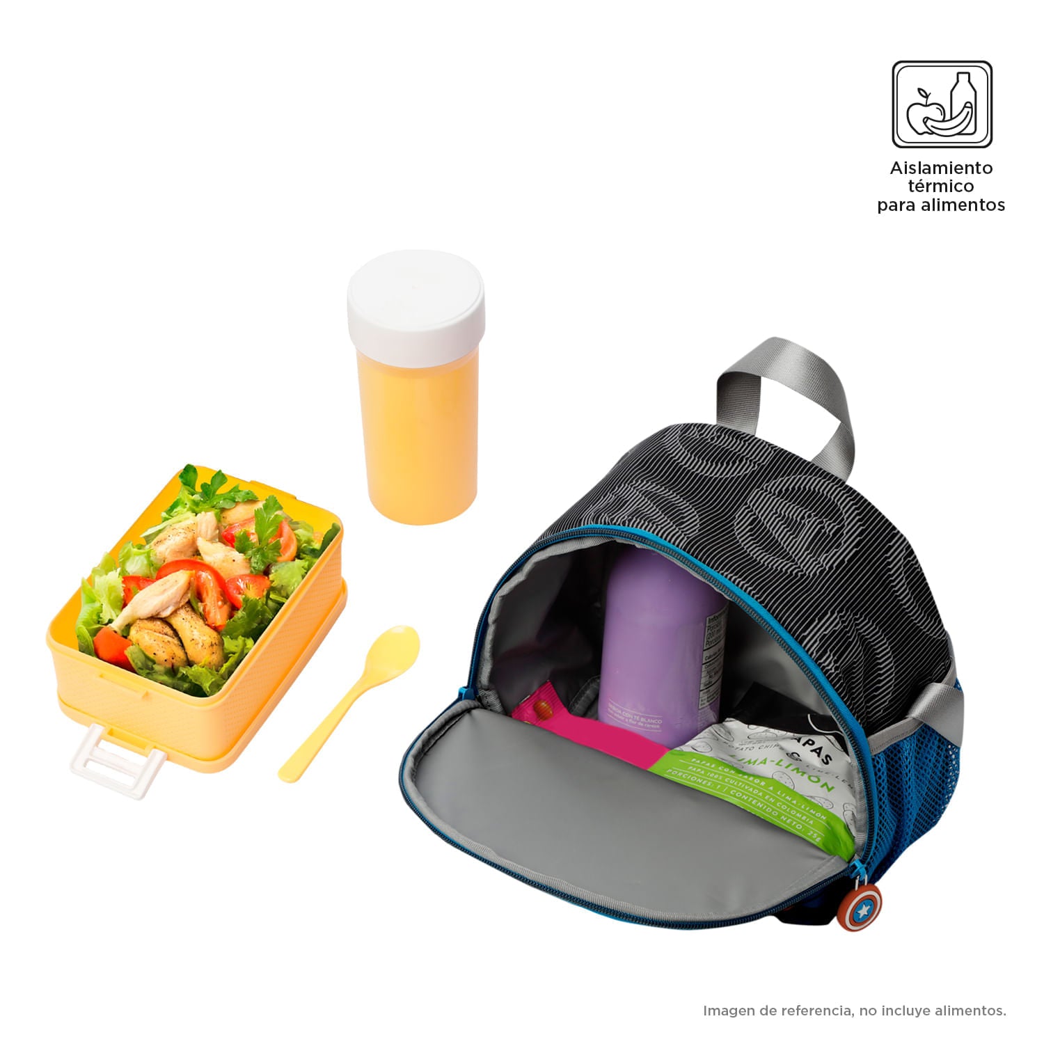 ¡El poder del Capitán América en cada comida! Esta lonchera térmica tiene un increíble diseño del superhéroe y un amplio compartimiento con cierre de doble cremallera. Sus bolsillos laterales con elásticos aseguran las botellas, mientras que la reata ajustable permite llevarla al hombro o cruzada. Además, cuenta con una banda trasera para anclarla al morral con ruedas. ¡Perfecta para llevar el almuerzo al colegio!