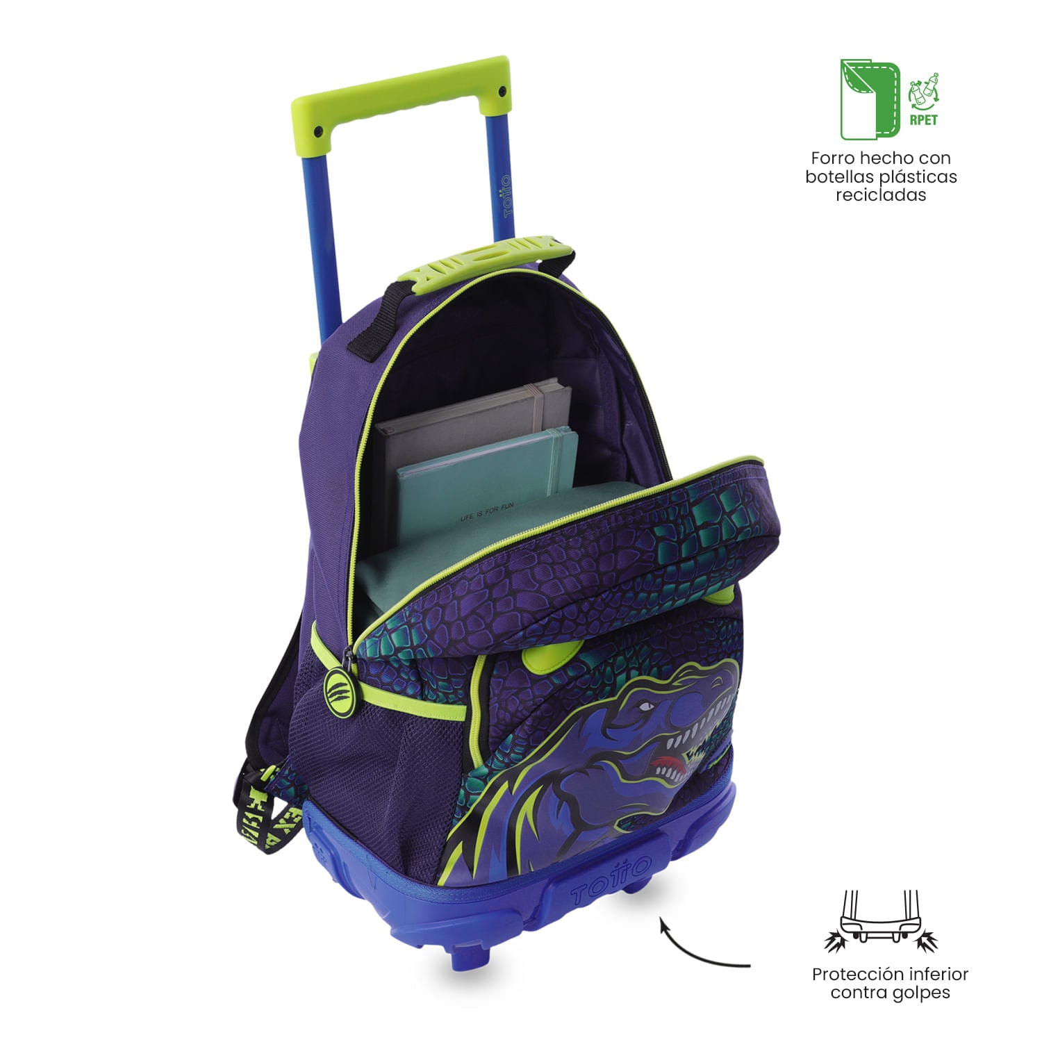 ¡Haz que cada día escolar sea más divertido con la maleta de ruedas mediana Dino Rock! Confeccionada en poliéster y forro RPET, cuenta con un compartimento principal de gran capacidad con doble cremallera, correas acolchadas ajustables y bolsillos laterales portabotellas. Su llamativo diseño de tiranosaurio rex en tonos vibrantes y el llavero de goma en forma de dinosaurio la hacen única. ¡Perfecta para acompañar a tu niño en el colegio!