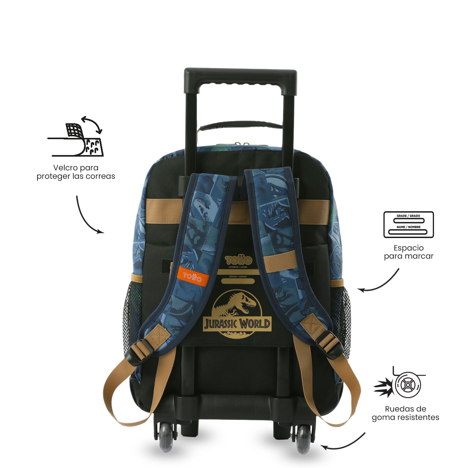 ¡Lleva contigo la emoción de Jurassic World! Esta maleta de ruedas infantil mediana combina resistencia y comodidad gracias a su confección en poliéster con forro interno en RPET, material elaborado con botellas plásticas recicladas. Su compartimiento principal de doble cremallera, las correas acolchadas regulables y los bolsillos laterales portabotellas brindan total practicidad. Además, su estampado y llavero en goma añaden un toque único. ¡Hazla tuya hoy!