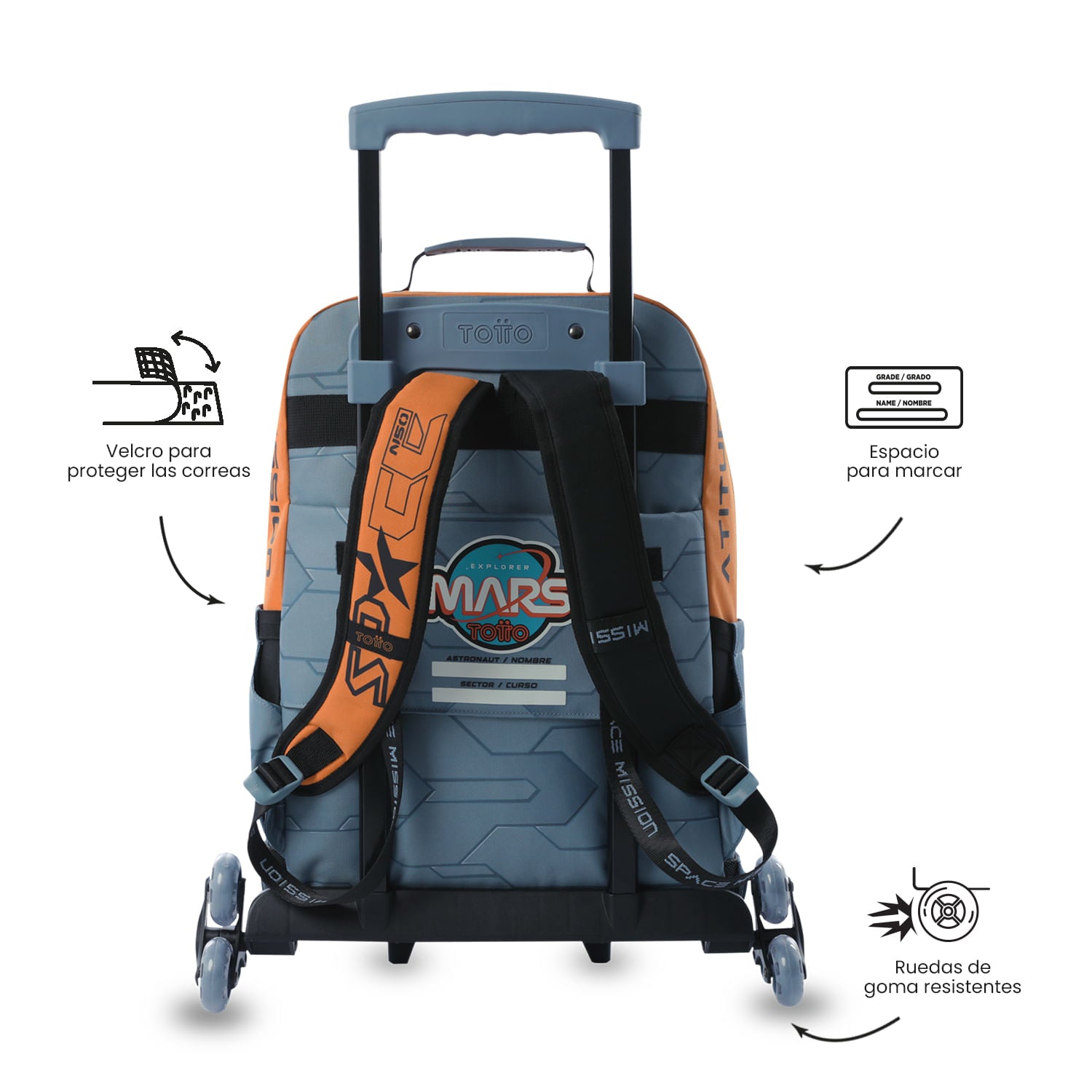 ¡Equípalo para su próxima misión espacial! La maleta para niño con tres ruedas Gemini en tamaño grande tiene un frente semirrígido con el diseño de un astronauta, bolsillo frontal, doble cremallera, laterales para botellas, manija superior y correas acolchadas. Incluye pines extraíbles tipo push pin y llavero con mosquetón. Además, fue fabricada con forro RPET reciclado en su interior. ¡Una opción que destaca en cualquier clase!
