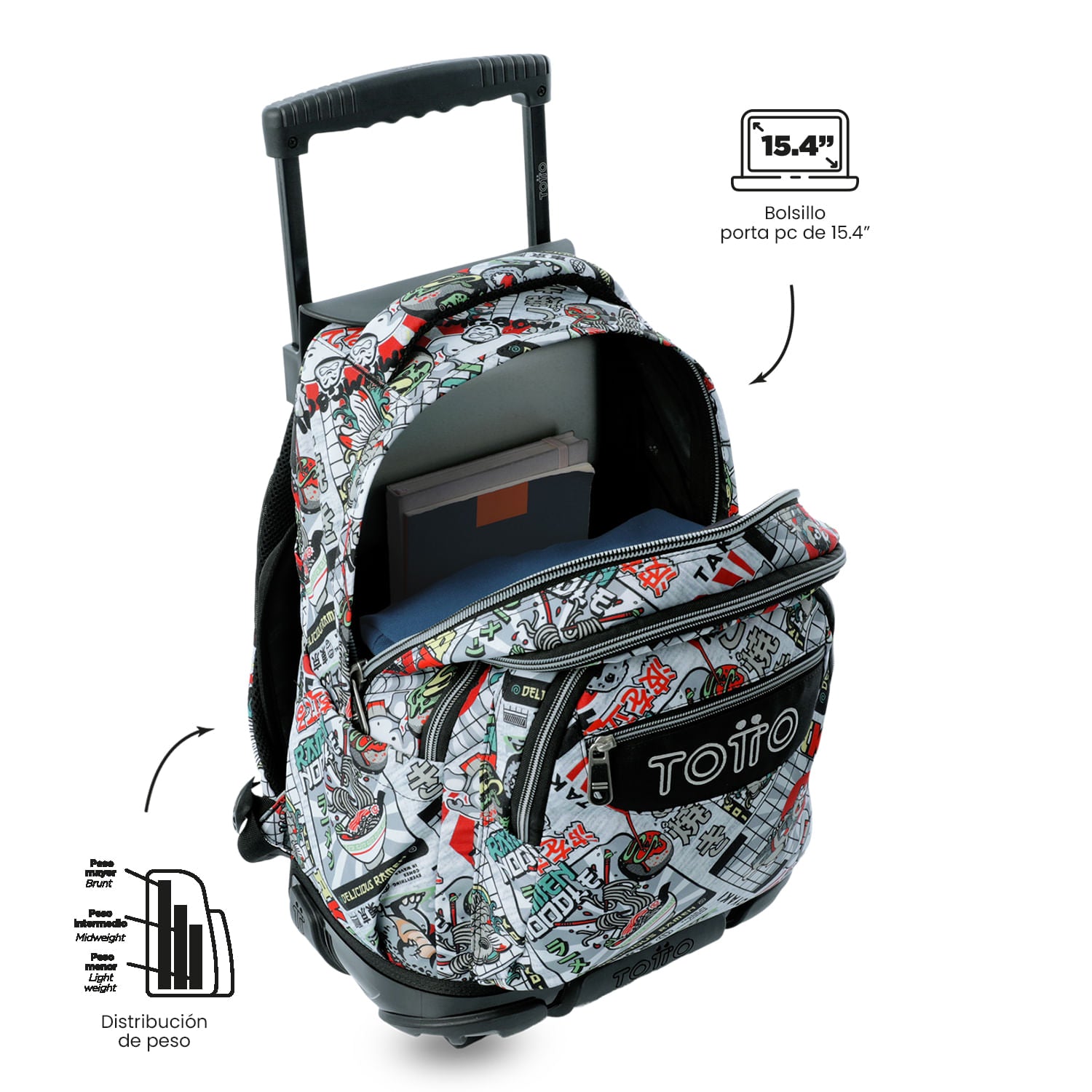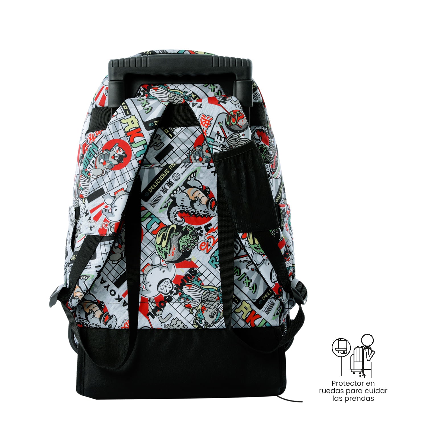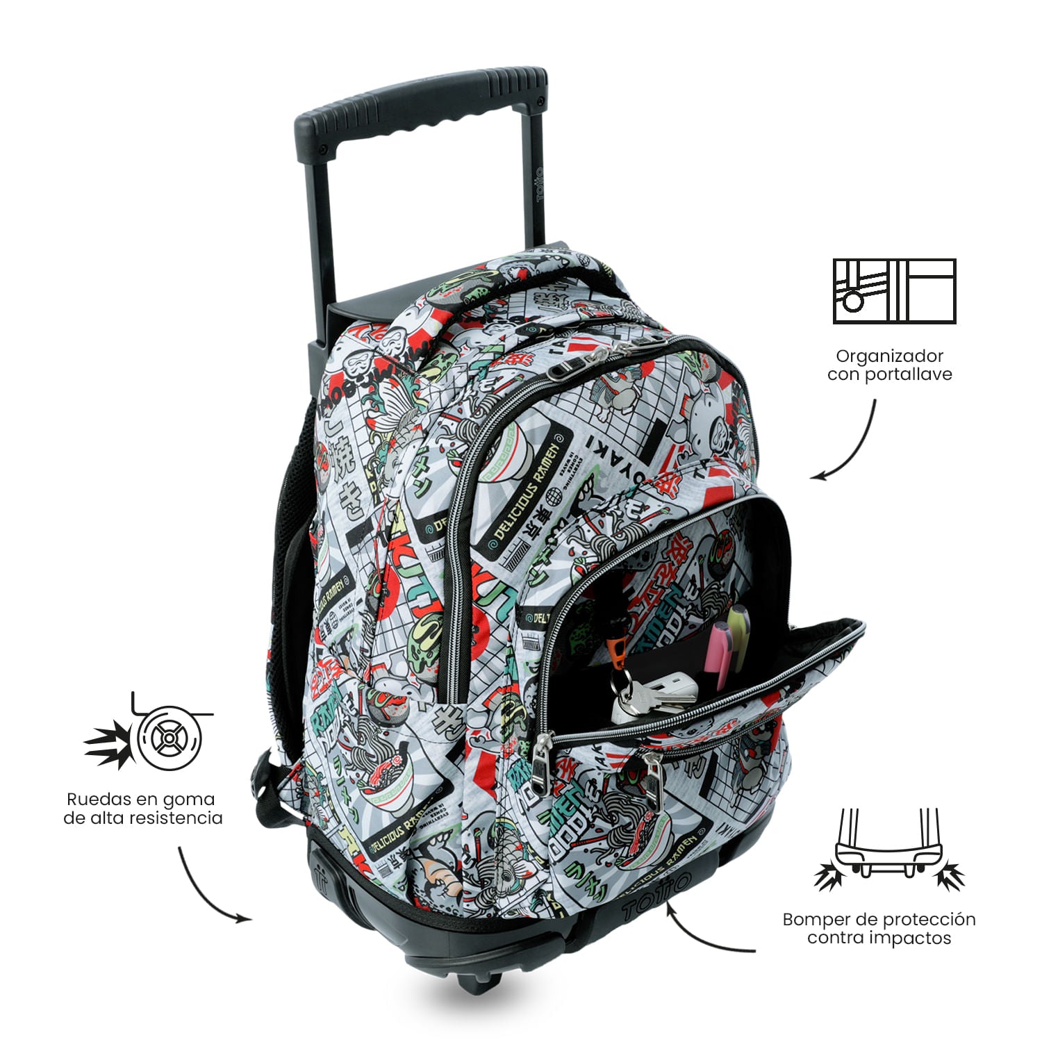 ¡Ofrece a tu pequeña, funcionalidad y resistencia con el morral con ruedas Renglón! Este modelo está fabricado con lona RPET a partir de 13 botellas recicladas y cuenta con un compartimiento para tu portátil de 15.4". Incluye un organizador con portallaves, ruedas de goma de alta resistencia y bómper de protección contra impactos. Su manija telescópica y protector de correas ofrecen un uso práctico y seguro. ¡Cómpralo ya!