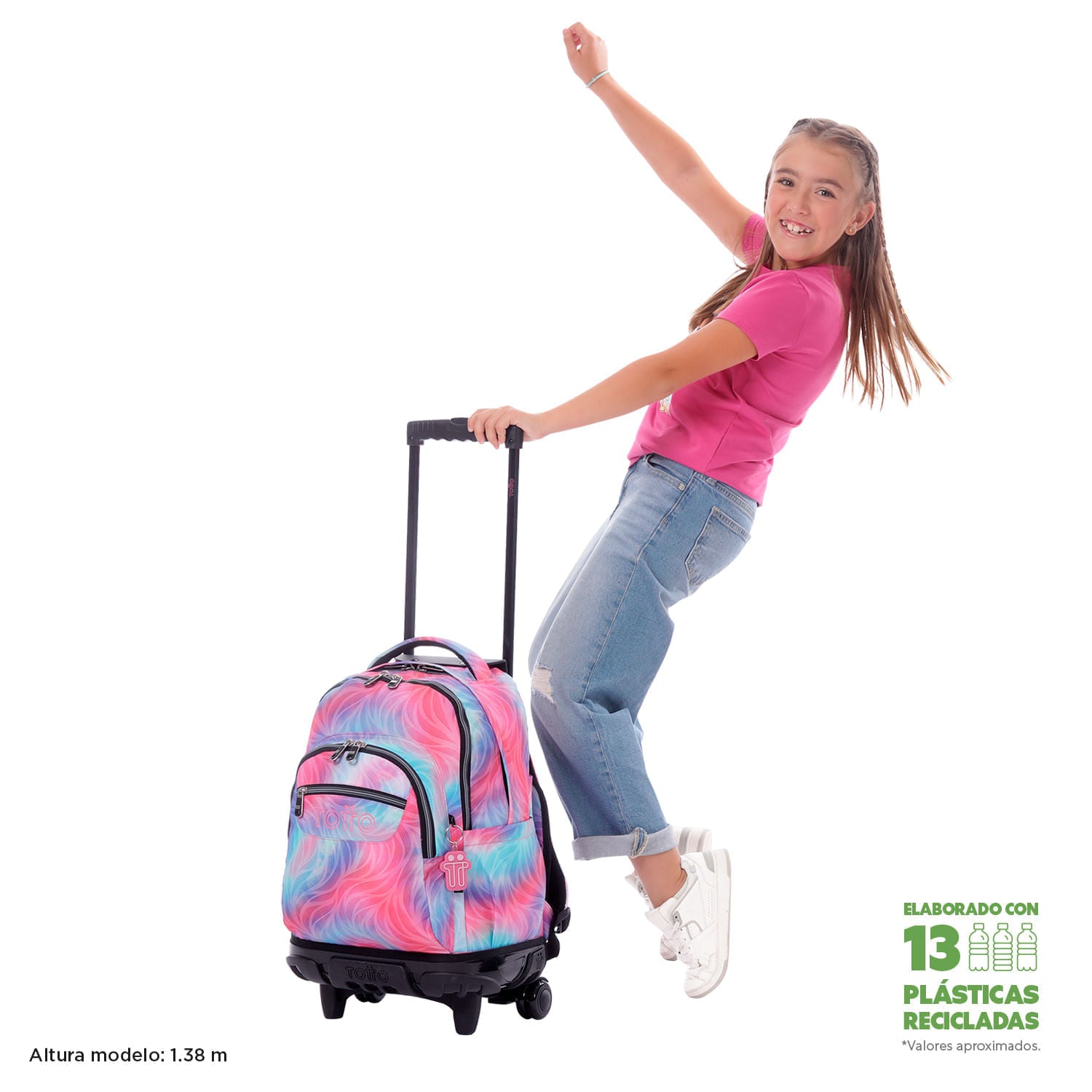 ¡Haz que cada día sea más brillante con el morral con ruedas Renglones Glitter! Este modelo con acabado glitter, diseñado para niñas, está fabricado con lona RPET a partir de 13 botellas recicladas. Cuenta con un compartimiento porta PC de 15.4", un organizador con portallaves y un bolsillo para botella. Las ruedas de goma de alta resistencia, el protector de correas y la manija telescópica brindan comodidad. ¡Adquiérelo hoy mismo!