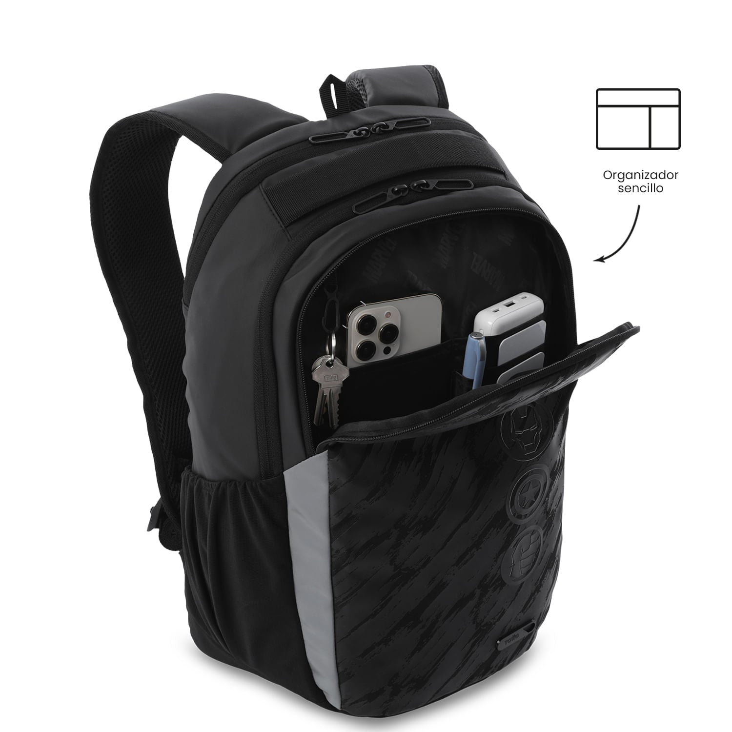 ¡Un compañero perfecto para tus días! El morral grande Marvel Black está confeccionado con materiales de alta calidad, como poliéster, ofreciendo durabilidad y resistencia. Su diseño estampado único de Marvel lo hace destacar. Incluye un compartimento especial para PC o tableta de 14 pulgadas, brindando la funcionalidad que necesitas. ¡Ideal para llevar tus esenciales con comodidad y estilo!